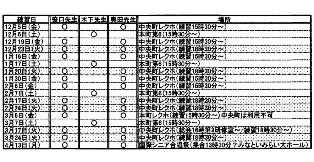 笹口先生のユーモラスなアクション混じりのご指導に笑いもあり、奥田先生のピアノに聴き惚れることも。もちろん合唱団メンバー先輩方が素晴らしいのは言うまでもありません。これからも末永く歌っていきたいです。